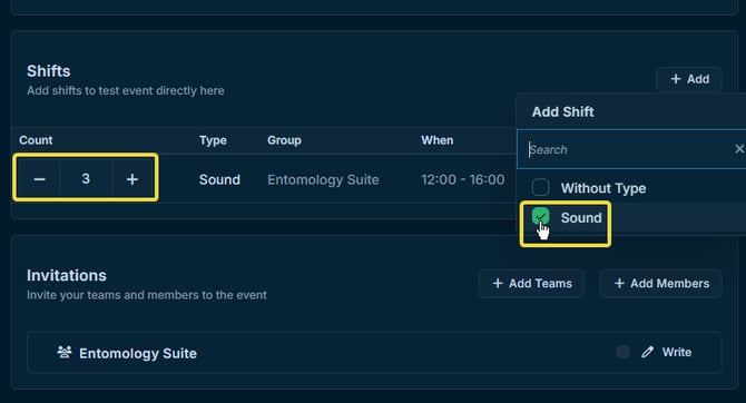 When adding shifts during event creation, you can add several shifts at once by increasing the count. |