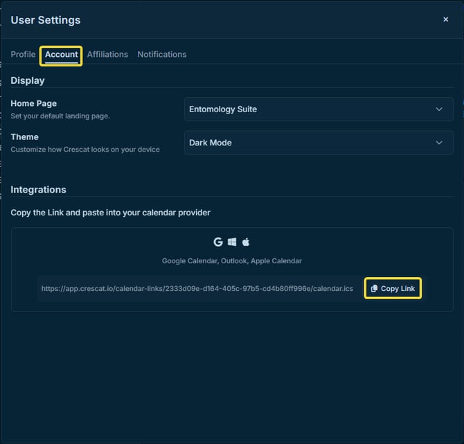 Select the Account tab, then under Integrations, you may generate your calendar link if it's not already there, or copy it if it is.