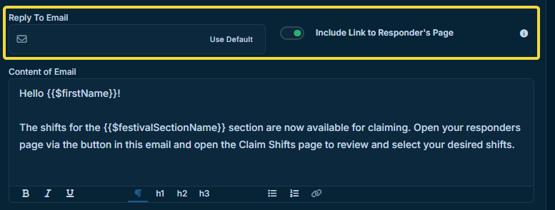 Above the email body, you can set the Reply To address, and optionally include a button in the email that takes the responder to their Responder's Page.