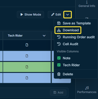 You can download a PDF or CSV file of any Running Order by clicking the downward arrow next to the Edit button within the event's Running Order.
