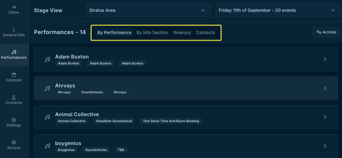 The Performances tab helps you review the performances connected to the selected venue or room. Depending on the information available to you, you may review the following across one or all days: