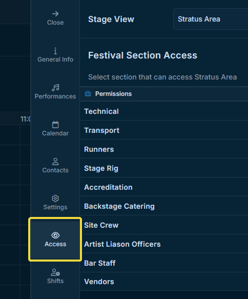 To see the Stage View in a Festival Section, the section must first receive access.