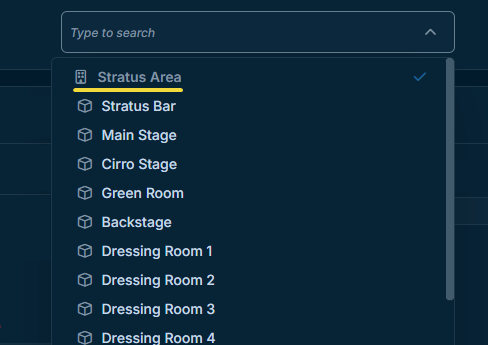 If a venue has several rooms, you can move between the venue-level overview and the individual rooms from the same selector.