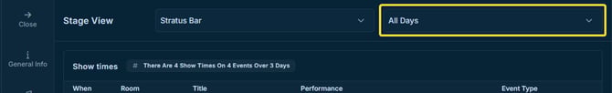 The Performances tab helps you review the performances connected to the selected venue or room. You may review the following across one or all days: