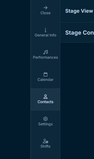 The Contacts tab shows the stage contacts connected to the selected venue or room. See who is responsible, how they are connected to the stage, and what contact information is available for the selected context. |