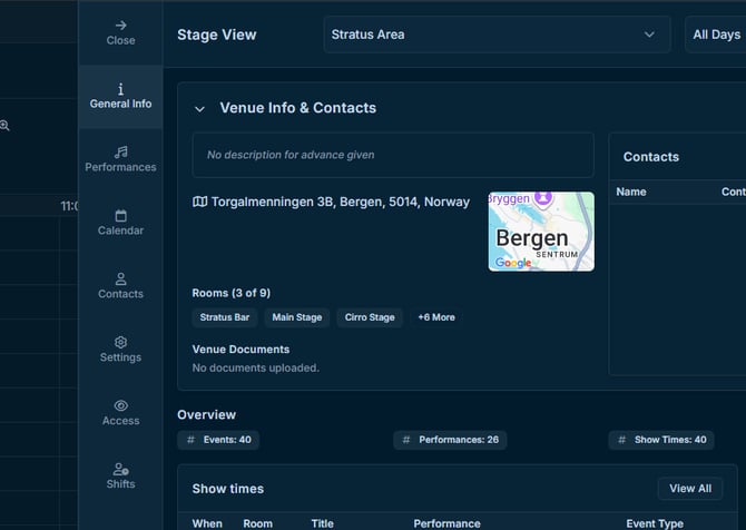 Try Stage View when you are already working with the festival’s connected venues, and want to move directly into a stage-focused overview.