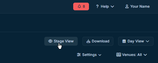 The stage view button is in the upper right of the Venues page.