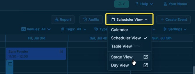 Try Stage View when you are scheduling work and want to switch from a broad calendar view to a focused venue or room view.